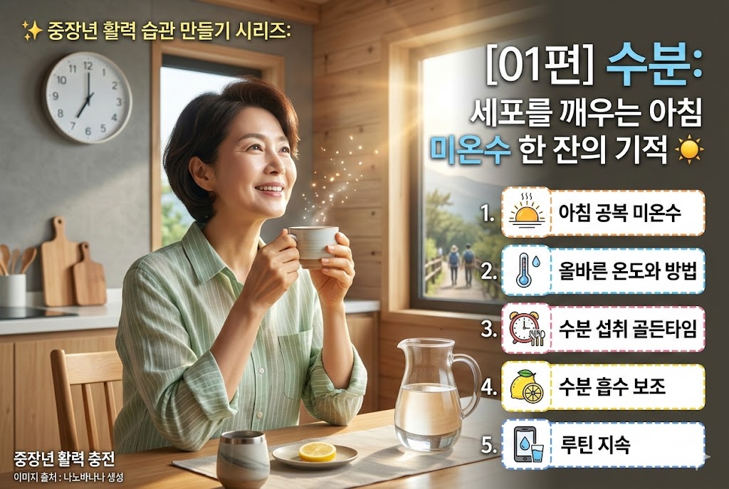 📌 핵심 요약: 아침에 마시는 미온수 한 잔은 밤새 잠들었던 신진대사를 깨우고 체내 독소를 배출하는 '가장 저렴하고 강력한 보약'입니다. 단순한 갈증 해소를 넘어 혈액 순환을 돕고 장 운동을 활성화하여, 중장년기 활력의 기초인 세포 수분도를 최상으로 끌어올리는 건강 자산의 첫걸음입니다. (150자 내외)